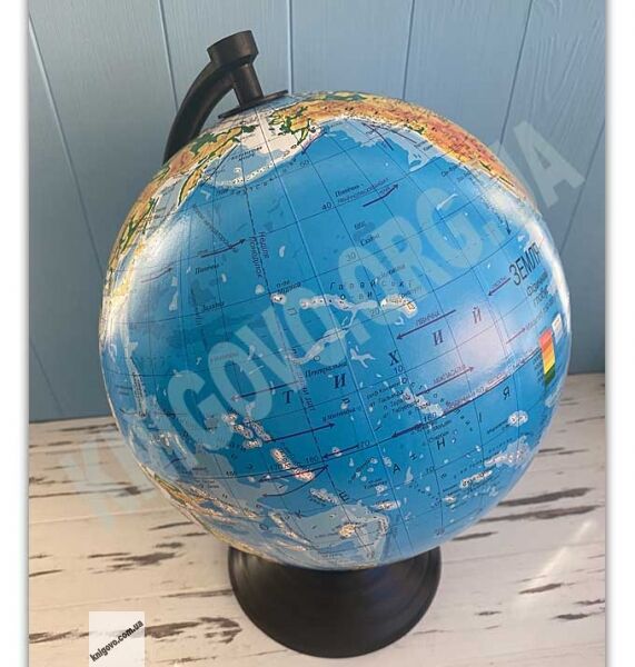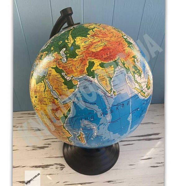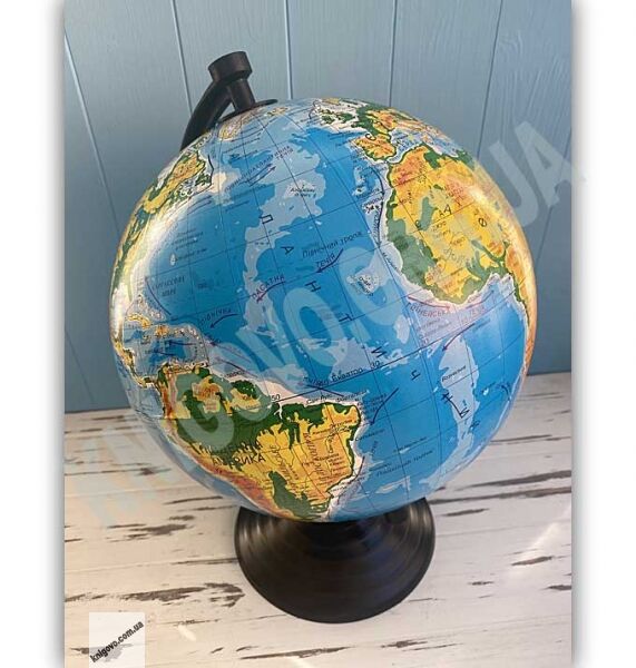 Глобус настільний фізичний український. Глобус (лат. globus куля) з картографічним зображенням на поверхні, що передає наочно у зменшеному вигляді форму об'єкта, зберігає геометричну подібність контурів, співвідношення площ і єдність масштабів в усіх напрямах.