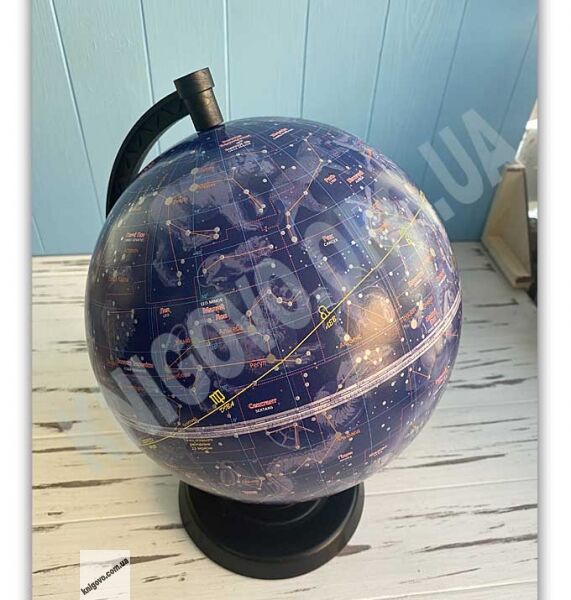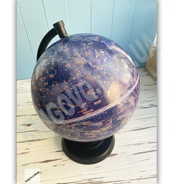 Глобус Зоряне небо. На підставці українська мова. На ньому є зірки, їх назви та сузір'я.