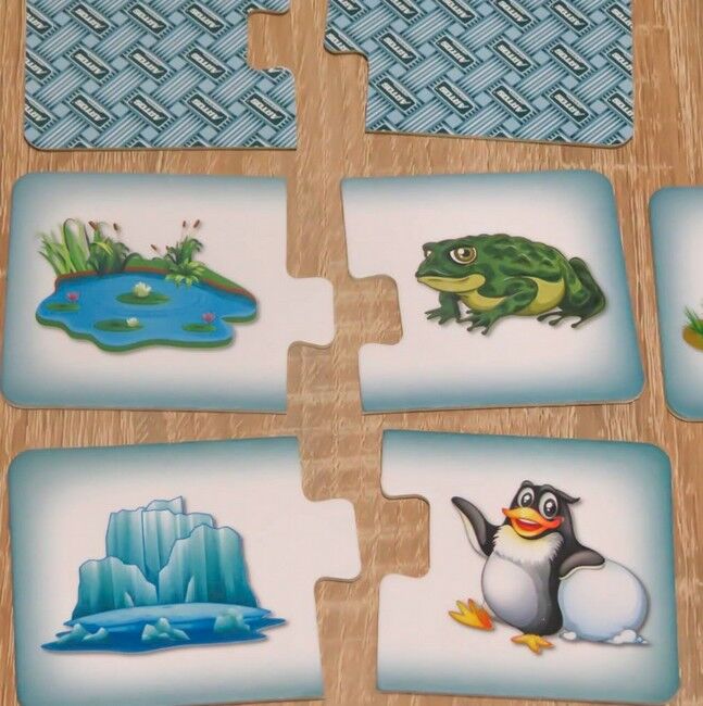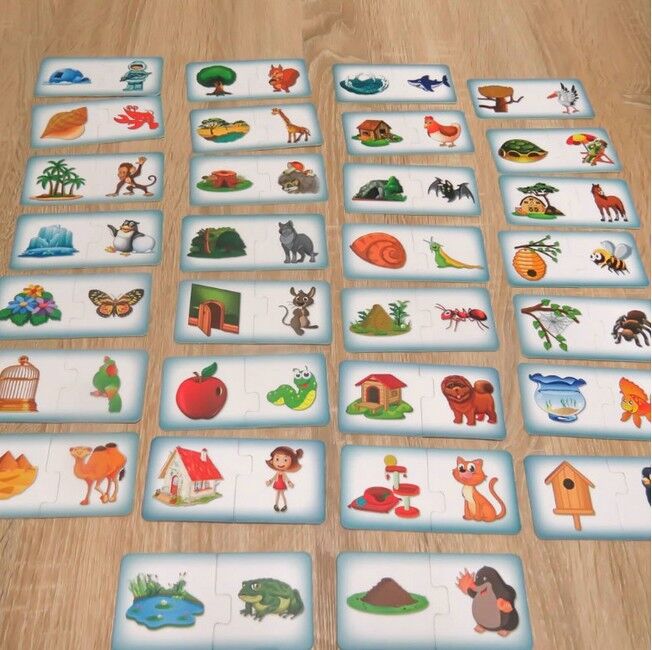 Настільна гра «Чия хатинка» представляє собою дидактичну мозаїку для дітей. В неї входить 30 картонних карточок, кожна з яких складається з двох елементів. На половинках зображені знайомі малюкам персонажі, до яких потрібно підібрати пару із зображенням відповідної хатинки.