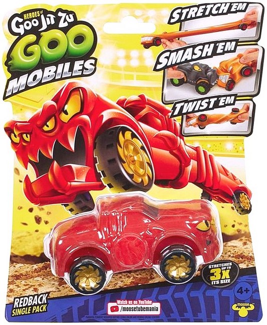 Герої Goo Jit Zu Goo Mobiles! Ці гоночні машинки змінюють форму та створені для зіткнення! Зіштовхніться! Розбий їх! Поверніть їх! Ці гоночні машини рухаються як ніщо інше на дорозі, новий рівень перетворення. Фігурка приємна на дотик, розтягується до 3-х разів, скручується і потім легко набуває свого первісного вигляду. Абсолютно новий All-Goo спосіб гри без безладу!