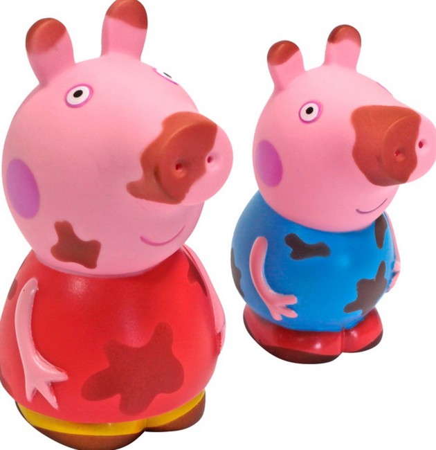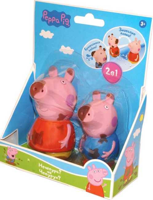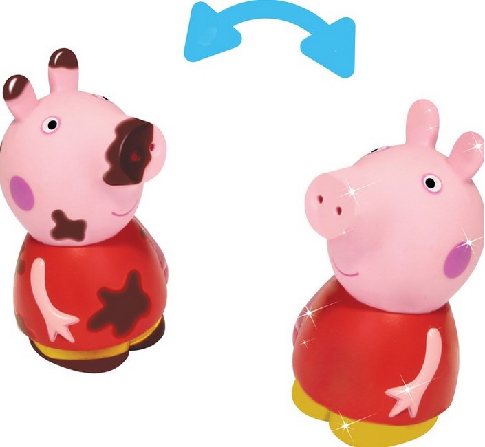 Пеппа та Джордж стрибали по калюжах та бруду. Їм терміново треба помитися. Опустіть їх у теплу воду, і плями зникнуть, наче їх і не бувало. Дістаньте іграшки з води, почекайте трохи — ви побачите, як магічним способом цятки з'являються знову.
