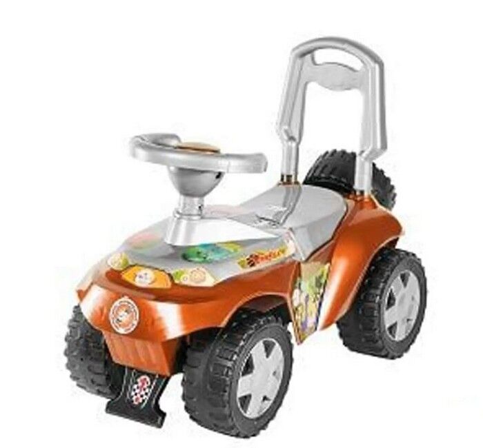 Машина виконана в яскравих кольорах, тому подобається як хлопчикам, так і дівчаткам. Кермо з клаксоном, так само за допомогою нього направляються два передніх колеса. Знімну ручку-спинку дуже зручно використовувати для перенесення машинки, а малюк може завжди на неї спертися. Під сидінням передбачено місце для іграшок або будь-яких дрібниць.