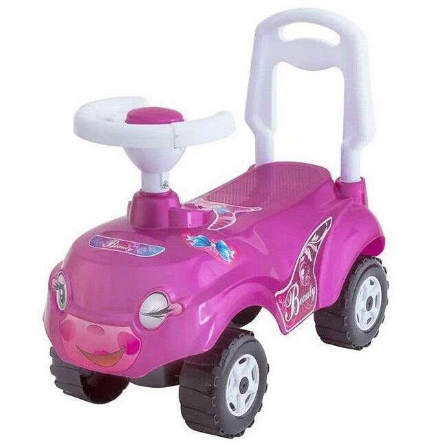 Машина виконана в яскравих кольорах, тому подобається як хлопчикам, так і дівчаткам. Кермо з клаксоном, так само за допомогою нього направляються два передніх колеса. Знімну ручку-спинку дуже зручно використовувати для перенесення машинки, а малюк може завжди на неї спертися. Під сидінням передбачено місце для іграшок або будь-яких дрібниць.