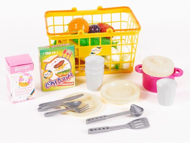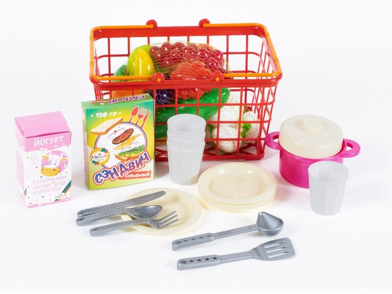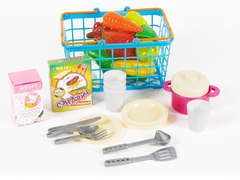 У наборі: кошик, різні фрукти, овочі і муляжі продуктів харчування.