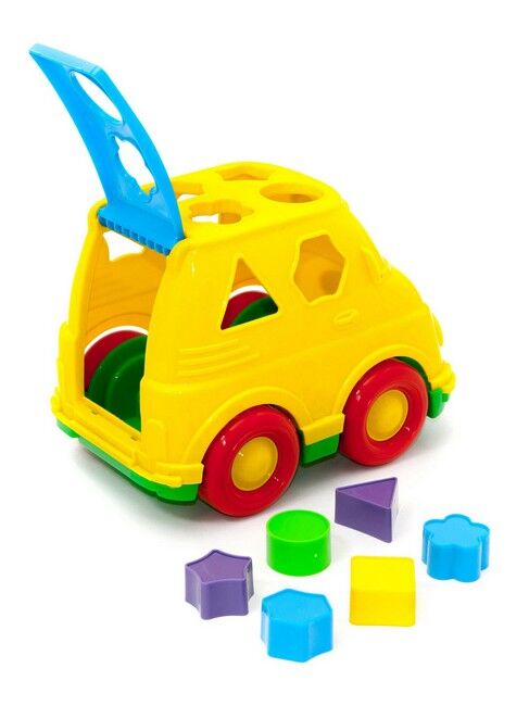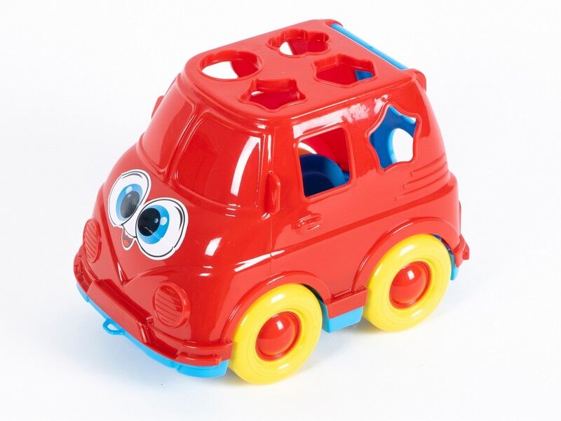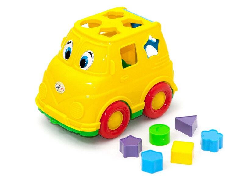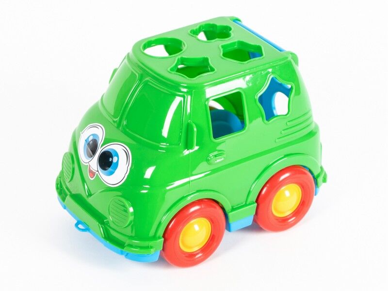 Мікроавтобус – прекрасна іграшка для малюків від 3 років, яка неодмінно сподобається і захопить у світ ігор. Крім того, що їм можна грати як машинкою, вона ще має ряд розвиваючих здібностей, так як є сортером. Суть гри полягає в тому, щоб правильно протягувати геометричні фігури в отвори на мікроавтобусі. Це розвиває уважність, логіку, мислення, дрібну і велику моторику рук дитини. Крім цього, за допомогою цієї іграшки можна вивчати кольори і геометричні фігури. У набір входять: блакитниі шестикутник і квіточка, фіолетові трикутник і зірочка, зелений круг і жовтий квадрат.