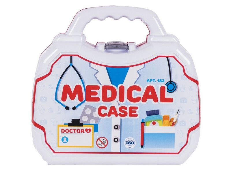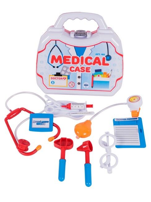 Медичну валізу виготовлено в білому кольорі, з яскравими, символічними наклейками. Матеріали, використані при виготовленні набору, мають високі якісні характеристики, стійкі до механічних навантажень і фізичного впливу. До комплекту входять: валіза, лоток, оглядове дзеркальце, медична карта, бейджик, окуляри, медичний молоточок, воронка, термометр, фонедоскоп, тонометр, шприц.