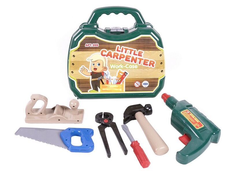 Набір призначений для дітей дошкільного віку і допоможе розвинути і виховати в них працелюбність, терпіння, покращити моторику, координацію рухів. До складу входять: молоток, кусачки, пила, рубанок, дриль, викрутка, свердло, валіза.