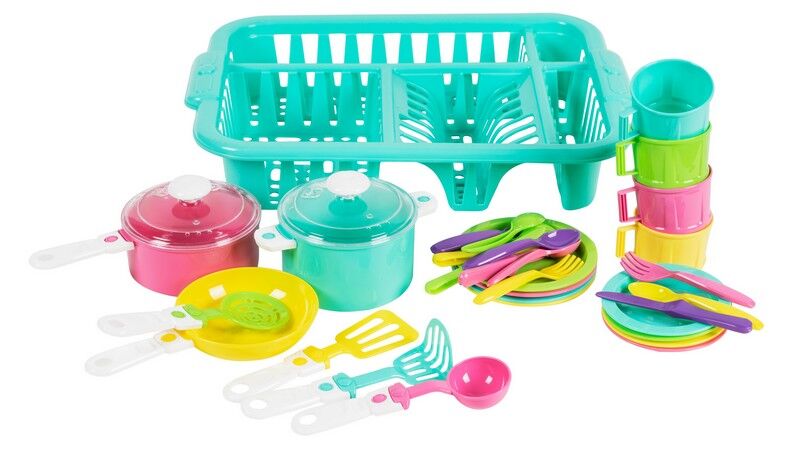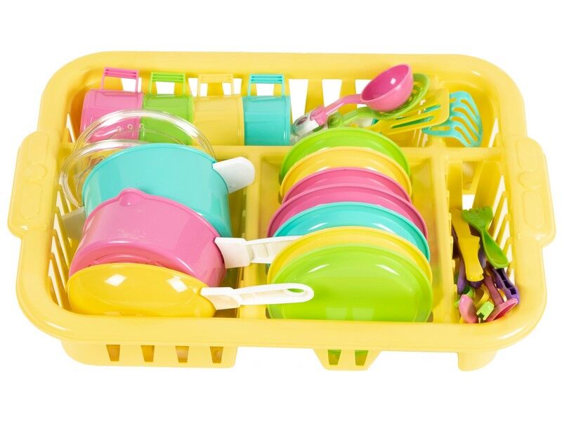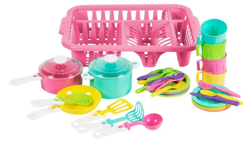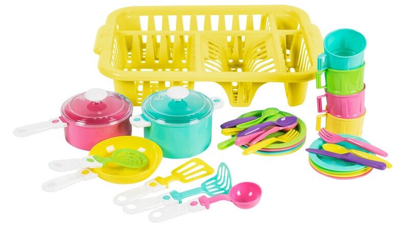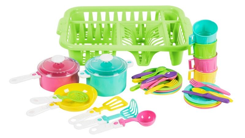 Набір виготовлений з міцних та надійних матеріалів, має приємну кольорову гамму. Незважаючи на добротність матеріалів, поранення ними неможливо, що вказує на високу якість виробу. До того ж застосовані матеріали не містять шкідливих для дитячого організму домішок, і токсичних речовин. До складу набору входять: Лоток - 1 шт., Каструля мала - 1 шт., Сковорода - 1 шт., Тарілка мала - 4 шт., Тарілка велика - 4 шт., Чашка - 4 шт., Сотейник - 1 шт., Кришка каструлі - 2 шт ., Картофелемялка - 1 шт., Лопатка - 1 шт., Шумівка - 1 шт., Ополоник - 1 шт., Ложка - 4 шт., Веделка - 4 шт., Ніж - 4 шт.
