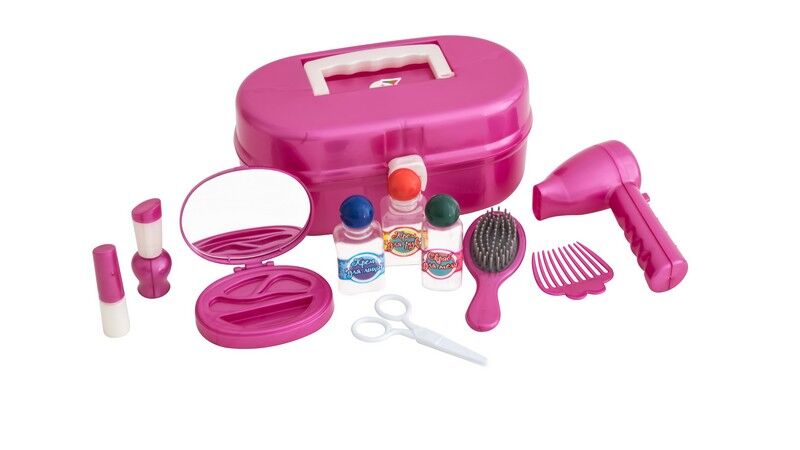 Кожна дівчинка змалечу мріє бути красивою. Тому саквояж із різноманітними інструментами догляду за собою безумовно викличе інтерес маленьких леді. До складу набору входить: Саквояж-1 шт., Гребінь-1 шт., Помада-1 шт., Пензлик для лаку-1 шт., Флакон для лаку-1 шт., Щітка 1 шт., Ножиці-1 шт., Косметичка- 1 шт ., Флакон прозорий- 3 шт., Фен-1 шт.