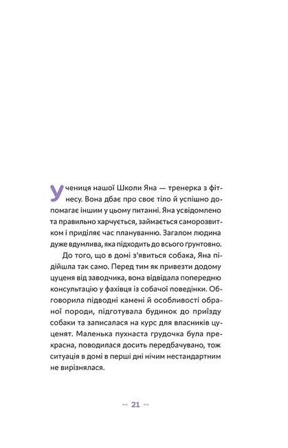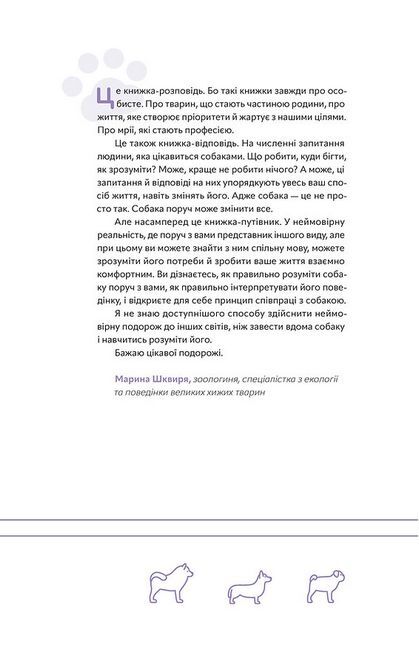 Книжка Оксани Галан допоможе полегшити цей процес для власника собаки. У книжці авторка детально розповість, як формуються рефлекси, на що слід зважати, коли у вашому житті з'являється собака, на які особливості тренувального процесу варто звернути увагу.
