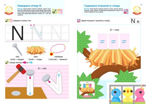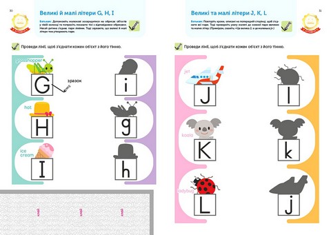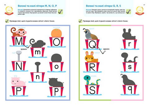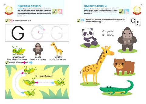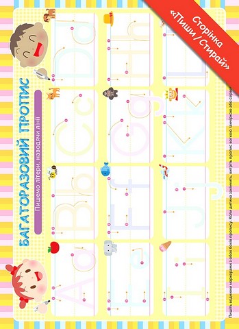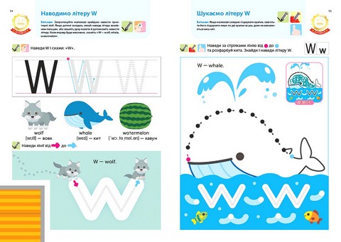 Абетковий порядок неважливий для вивчення літер, тому сторінки цього зошита не обов’язково проходити у якійсь визначеній послідовності. Якщо маля виявляє інтерес до певної літери або вправи, займайтеся ними, доки стане цікавості. Якщо ні — зробіть перерву чи перегорніть на іншу, цікавішу сторінку. Вправи у книжці розраховані на виконання за допомогою та під наглядом батьків. У кожної дитини свої темпи розвитку, і, виконуючи завдання разом, як одна команда, ви робите важливий крок до навчання з насолодою.