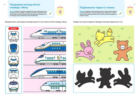 У вправах книжки «Gakken. Розумні ігри. Розвиток мислення. 3–5 років» дитині пропонується:
