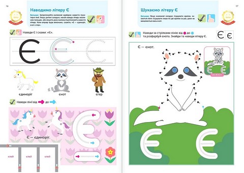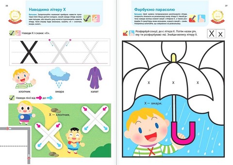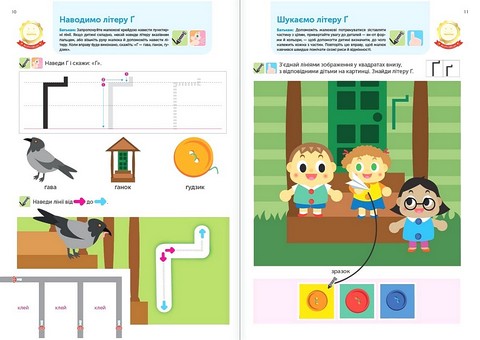 Абетковий порядок неважливий для вивчення літер, тому сторінки цього зошита не обов’язково проходити у якійсь визначеній послідовності. Якщо маля виявляє інтерес до певної літери або вправи, займайтеся ними, доки стане цікавості. Якщо ні — зробіть перерву чи перегорніть на іншу, цікавішу сторінку.