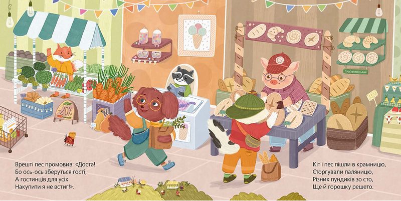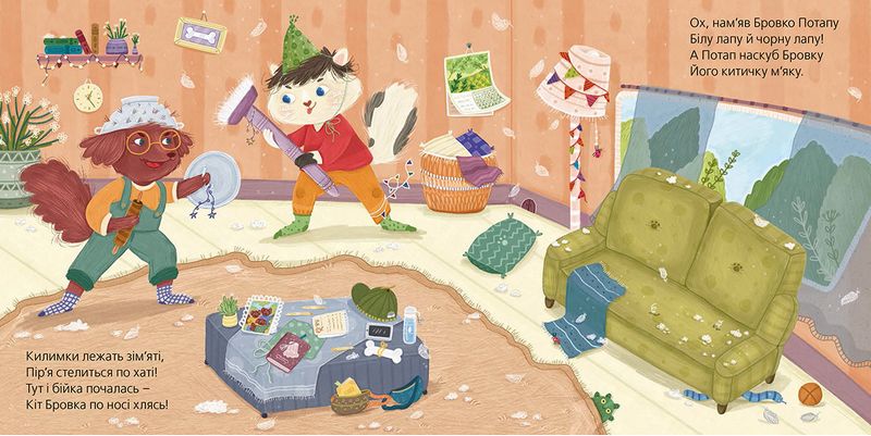 Кіт Потап завітав до свого друга, пса Бровка на іменини. Друзі стали бавитися і, коли схаменулися, згадали, що не купили частування для гостей. Гайнули в крамницю і влаштували гарне свято, на яке зійшлося багато звірят і птахів. А завдання для вашого малюка – порахувати лапи і хвости у цій веселій картонці-лічилці.