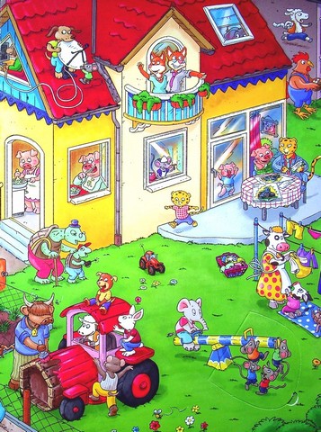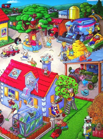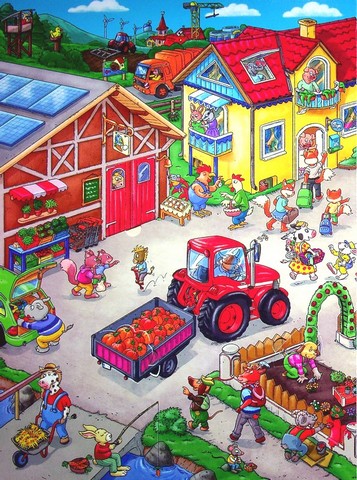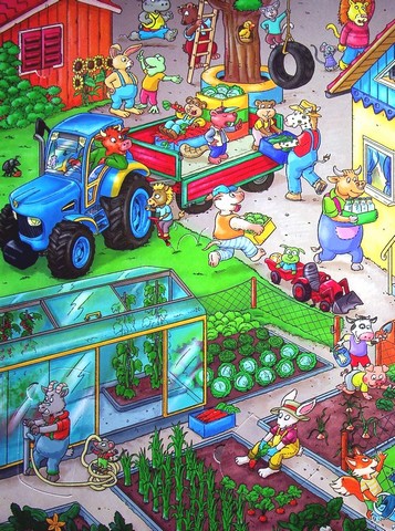 Тут стільки цікавих занять! Подивися: можна косити сіно, збирати в саду свіжі фрукти, запускати повітряного змія і навіть полагодити трактор! Вімельбух — розвивальна книжка-розглядалка для дітей з яскравими, деталізованими, максимально насиченими візуальною інформацією ілюстраціями.