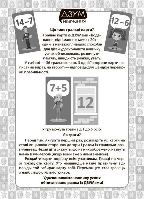 НУШ Навчальні гральні карти 36 карток Додавання віднімання в межах 20 Основа. Досліджуй! Знай! УМій! ДЗУМ-навчання серія навчальних книг та ігор, яка допомагає дітям вчити математику, мову та світ разом із цікавими персонажами родиною ДЗУМів, сучасних ґаджетоманів.