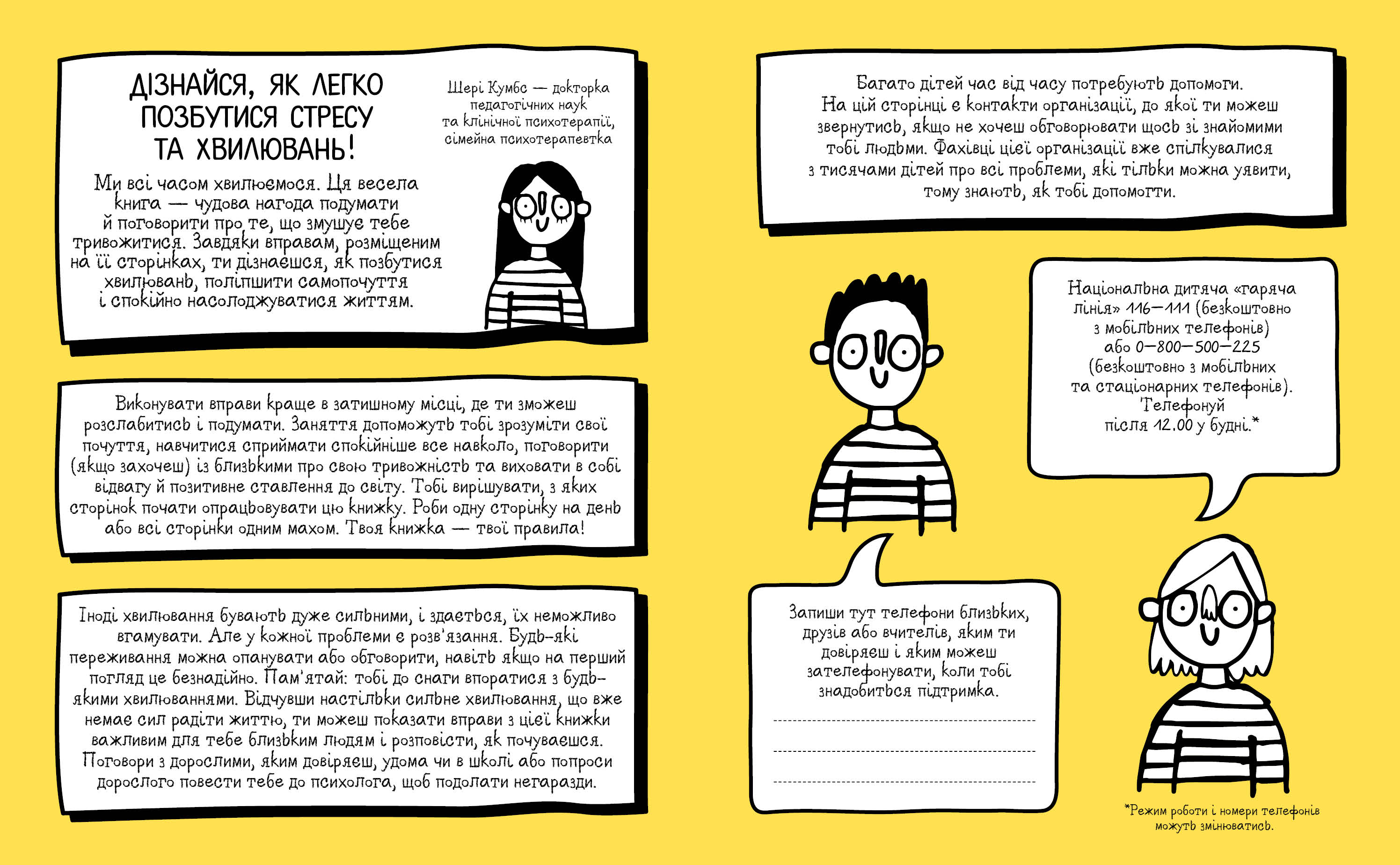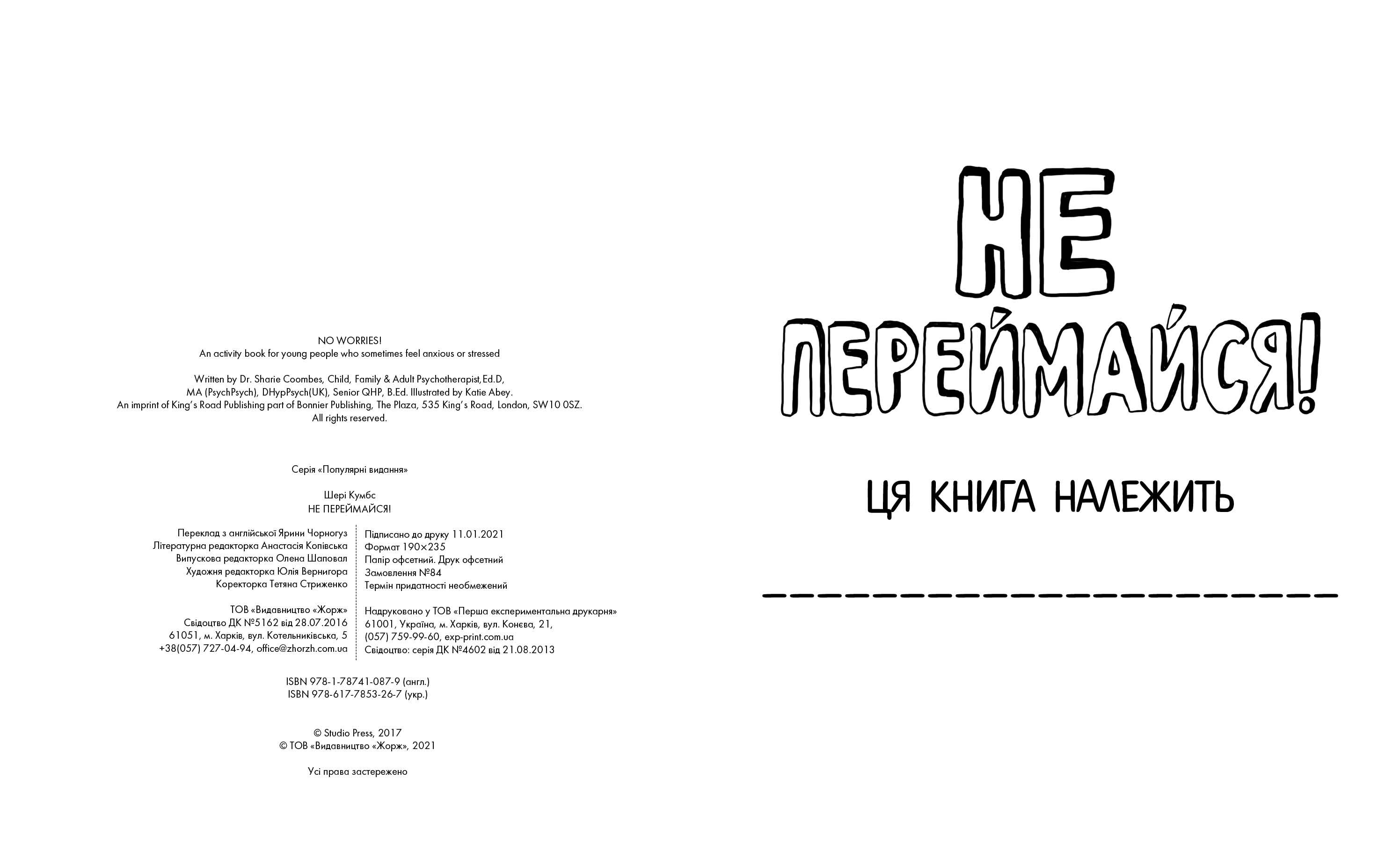 Не переймайся! Шері Кумбс Ранок. Мотиватор для тих, хто хоче позбутися стресу і зайвих хвилювань. Завдання цієї книжки допоможуть тобі зрозуміти свої почуття, позбутися тривожності та навчитися позитивного ставлення до життя. Вмикай креативність, випускай на волю уяву - малюй, пиши, виконуй цікаві вправи, щоб дати відсіч стресу та хвилюванням.