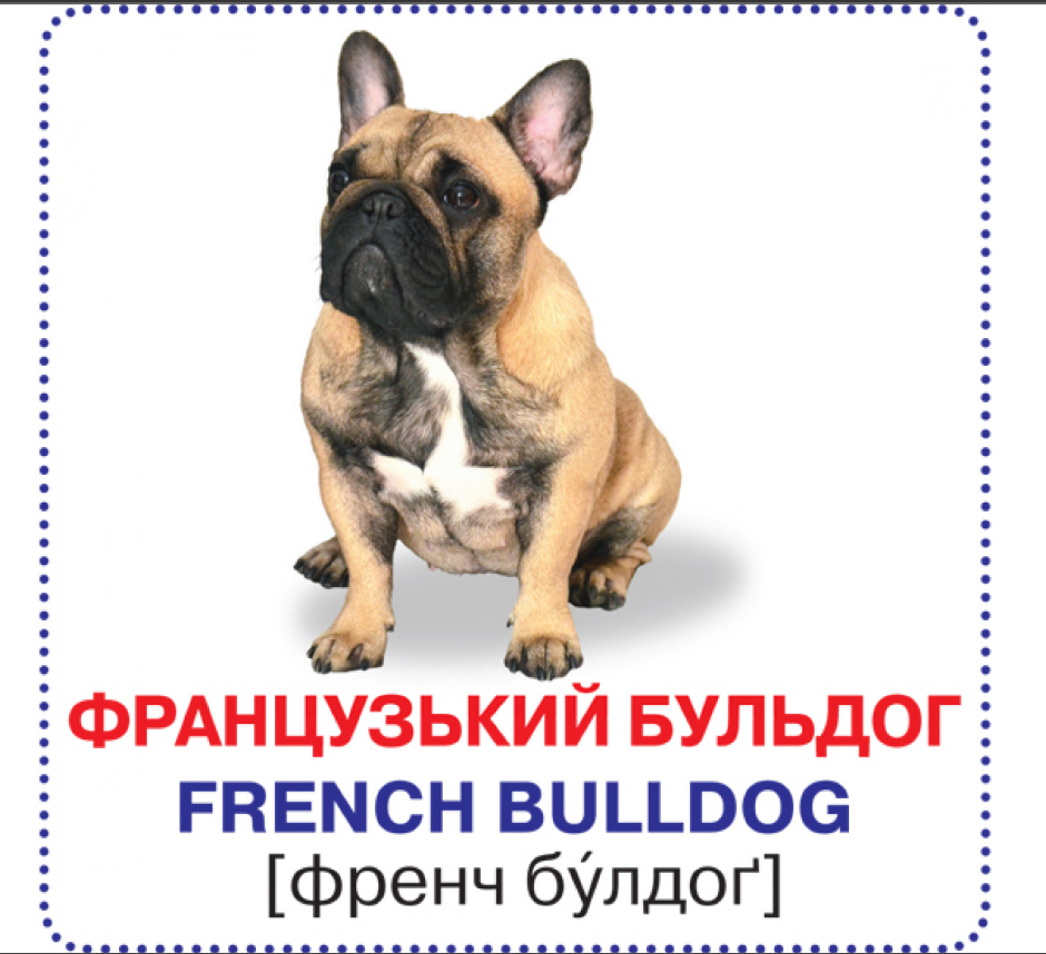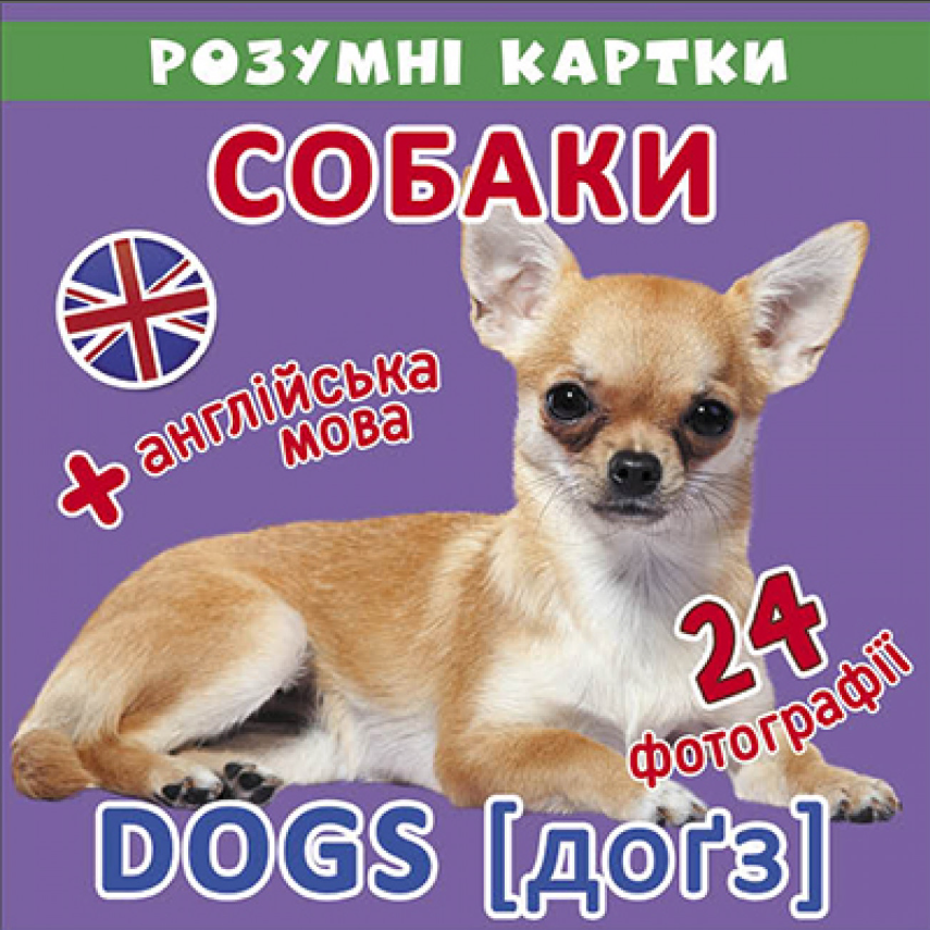 Розвивальні картки «Собаки» допоможуть дитині познайомитися з різними породами собак, вивчити їхні назви англійською мовою, тренуючи водночас зорову пам'ять, уважність і гостроту сприйняття. Набір складається з карток з яскравими зображеннями собак, на зворотному боці яких наводяться питання і завдання для занять з малюком.