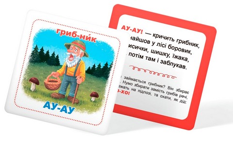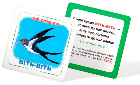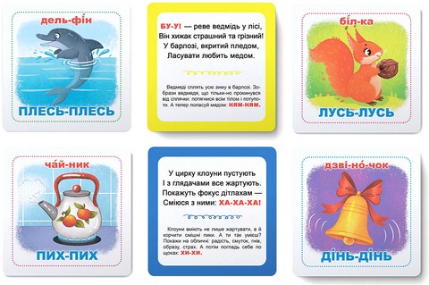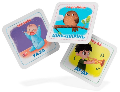 Набір «Знайомство зі звуками» включає 30 карток, на яких зображено тварину, предмет тощо, а також звук, що вони видають.
