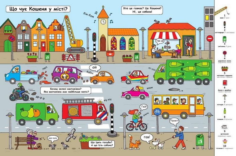 Кошеня мандрує світом, сповненим звуків. Що воно чує на фермі? Які звуки лунають у парку? А в зоопарку? На своєму шляху кошеня зустрічає різних тваринок. Цікаво, а чим його нові друзі полюбляють ласувати? Відкривай для себе, вивчай і порівнюй нові кольори. Вчися рахувати від одного до десяти. Шукай, спостерігай і досліджуй! До речі, зможеш знайти на кожній сторінці маленького блакитного жучка? Ця яскрава книжка із завданнями "знайди і полічи" може захопити вашого малюка надовго. Для допитливих малят від 3 років. Что слышит Котёнок? Котёнок путешествует в мире, полном звуком. Что он слышит на ферме? Какие звуки раздаются в парке? А в зоопарке? На своём пути Котёнок встречает разных животных. Интересно, а чем его новые друзья любят полакомиться? Открывай для себя, изучай и сравнивай новые цвета. Учись считать от одного до десяти. Ищи, наблюдай и исследуй! Кстати, сможешь найти на каждой страничке маленького голубого жучка? Эта яркая книга с заданиями "найди и посчитай" сможет увлечь вашего ребёнка надолго. Для любопытных малышей от 3 лет.
