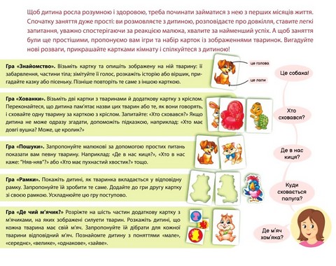 Немовля потребує спілкування з перших же днів. Щоб малюк ріс розумним і здоровим, грайте з ним! Ігри та набір карток «В оселі» спрямовані на всебічний розвиток дитини з перших місяців життя. В ході занять маля познайомиться зі свійськими тваринками - мешканцями оселі, а також засвоїть поняття «мале», «середнє», «велике», «однакове», «зайве». Встигніть якомога корисніше використати період, поки малюк сприймає все нове найінтенсивніше!