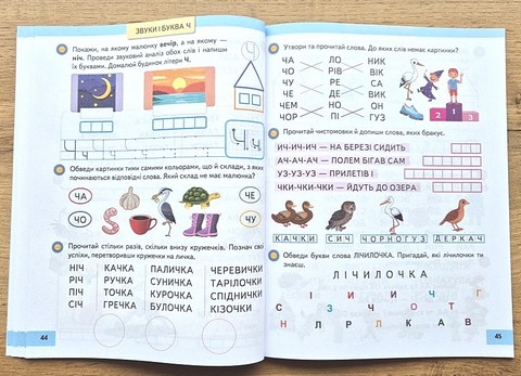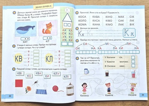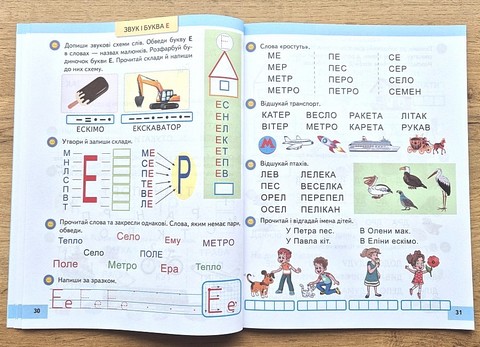 \nз перших сторінок розвиває навички читання, письма, звуко-буквенного аналізу через гру.