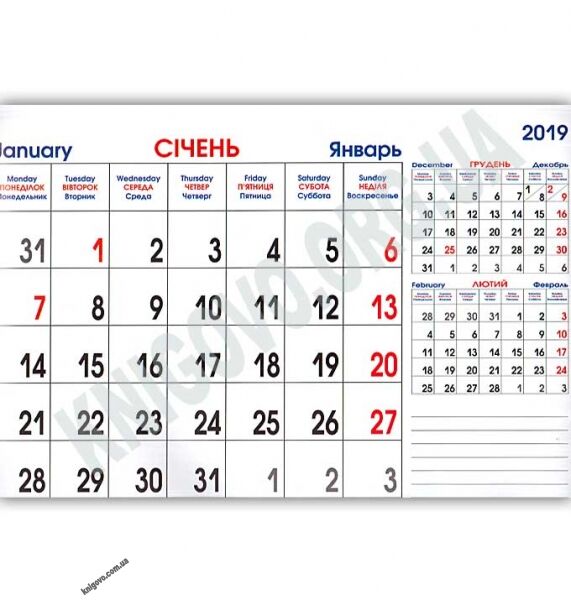 Календар 2019 настінний перекидний Український живопис, містить дві мови, українську та російську, кольорові зображення українського живопису.