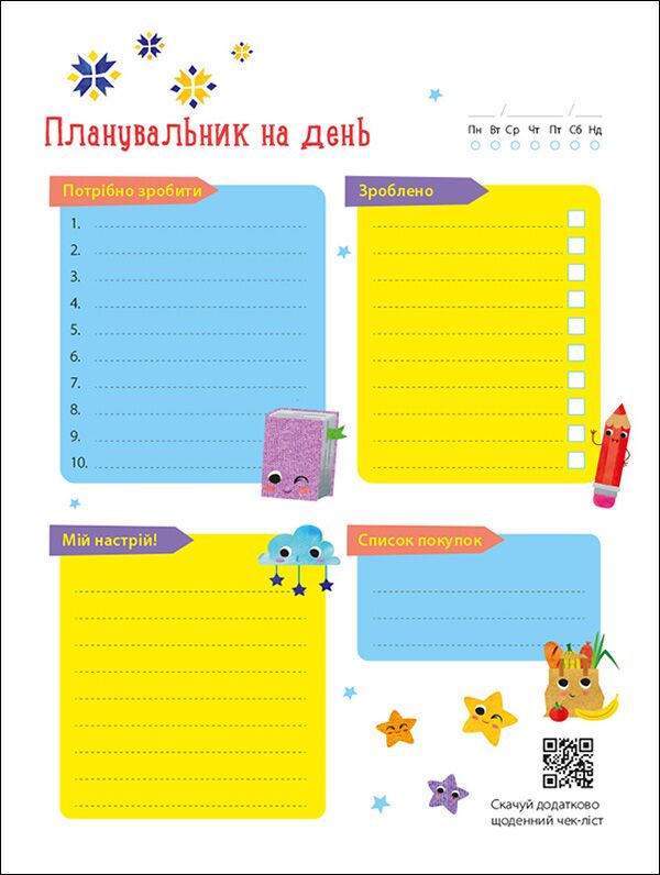 Планер-мотиватор для школярів допомагає навчитися планувати час, формувати корисні звички та бути завжди «на позитиві». На кожній сторінці планеру: - Календар на місяць. У ньому дитина позначає усі для неї важливі події та нотує ідеї. Для цього можна використовувати яскраві наліпки. Їх у планері аж 360: свята, дні народження, успіхи, настрій, гурток чи секції, додаткові заняття з репетитором, візит до лікаря, подорож, важливі моменти. Звичайно ж, потрібно приділяти час для гри, книжки та хобі. Для цього також є яскраві наліпки.