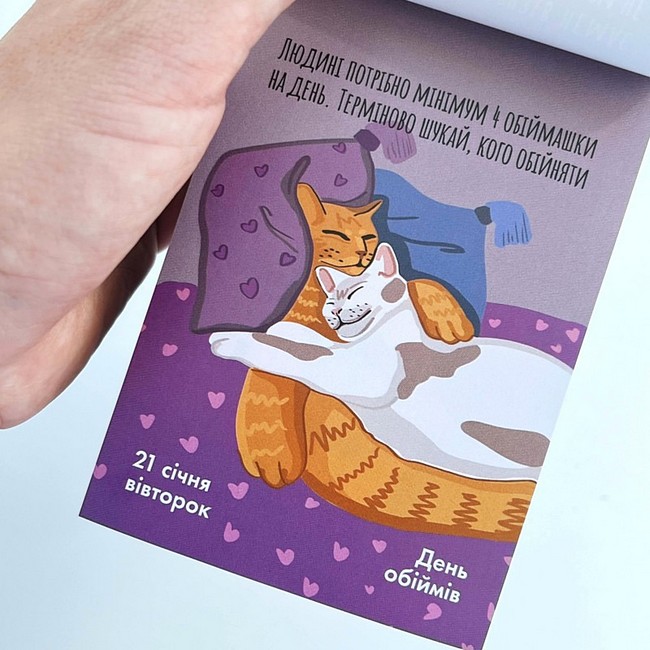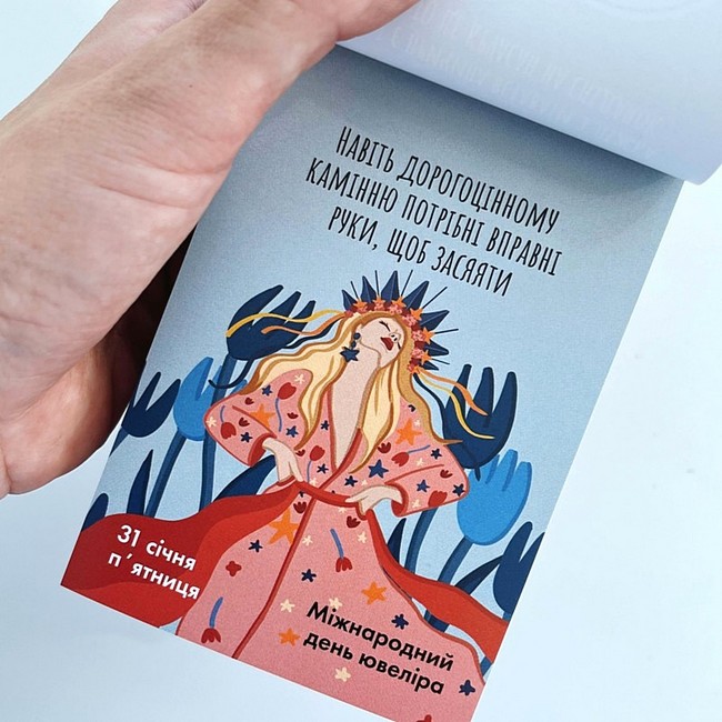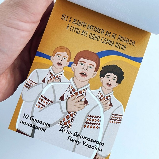 Календар пропонує 365 днів державних, професійних, релігійних та просто веселих свят. Кожна сторінка — нагода відірватись на честь свята, або ж злісно відірвати аркуш, щоб забути цей день. Це календар під кожен настрій, де ти знайдеш влучні, смішні чи мотиваційні вислови. А яскраві ілюстрації порадують око, адже кожну з них ми малювали самостійно.