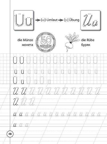 Дані прописи допоможуть усім бажаючим навчитися правильно писати друковані та рукописні букви німецького алфавіту та з’єднувати їх у слова. Крім графічних завдань, зошит містить лексичні завдання на закріплення вивчених літер. Книга призначена для батьків першокласників та вчителів молодших класів.