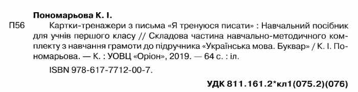Картки-тренажери з письма Я тренуюся писати 1 клас НУШ Авт: Пономарьова К.І. Вид-во: Оріон 19773
