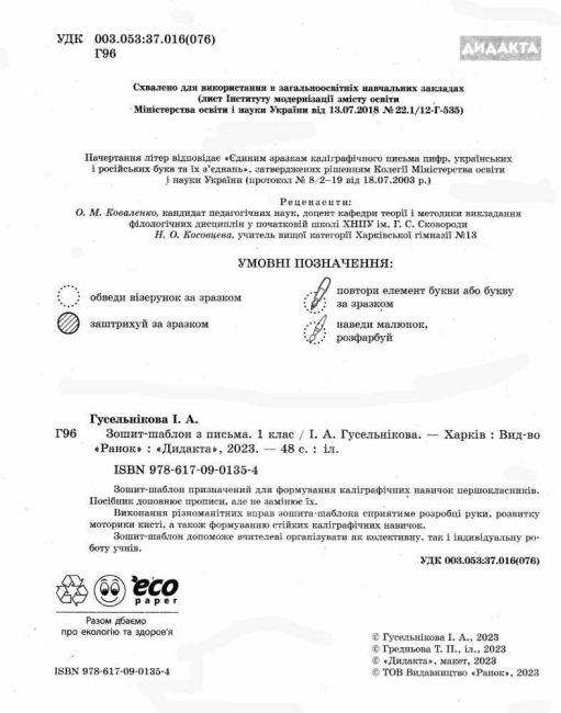 Зошит-шаблон з письма 1 клас НУШ Гусельнікова І.А. Вид-во: Ранок 19967