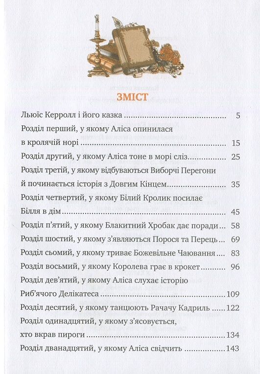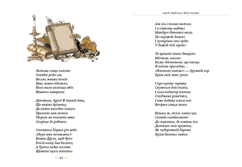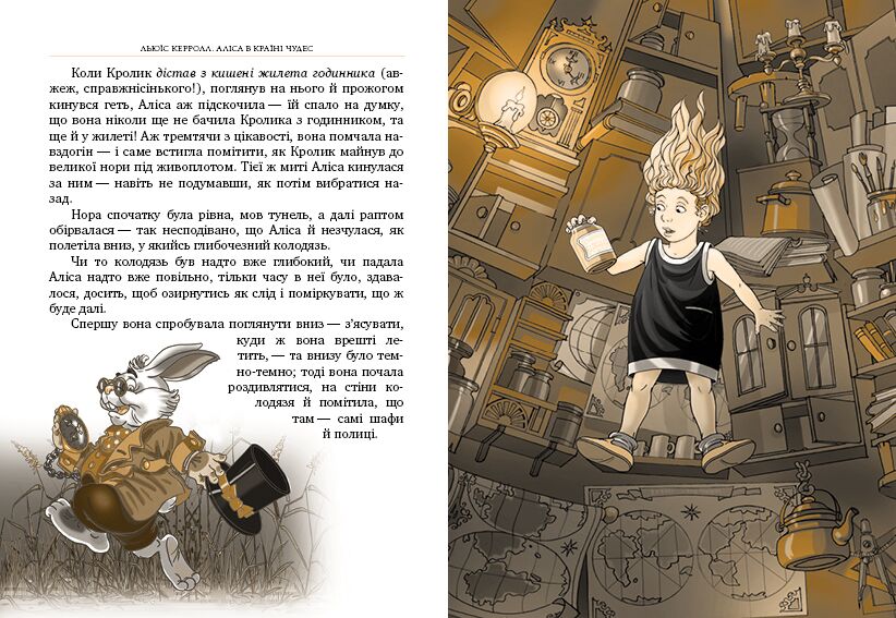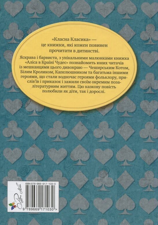 Ця книжка — шедевр дитячої літератури. Ще за життя автора її було перевидано більше тридцяти разів. Герої книжки — Капелюшник, Солоний Заєць, Чеширський Кіт та інші стали улюбленими для багатьох поколінь юних читачів і їхніх бітьків, і дістали прописку в багатьох прислів’ях і приказках. У захваті від цієї повісті була навіть англійська королева Вікторія. Видання щедро ілюстроване малюнками, що вдало передають дух безсмертного твору.