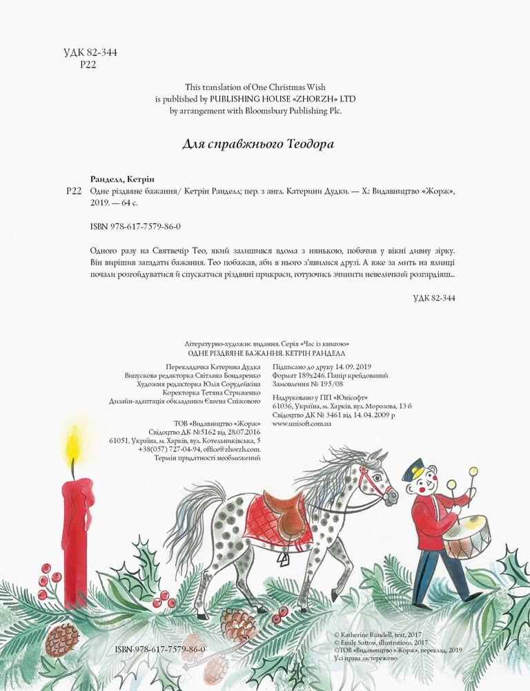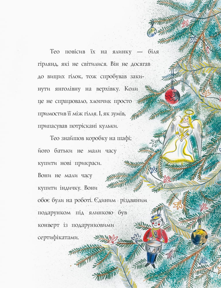Ця книга — наче вінтажна ялинкова прикраса. Класичне поєднання кольорів. Обкладинка з текстурного дизайнерського картону кремового кольору з яскравими червоними написами. Золоте тиснення на всю площу обкладинки — і з лицьового, і зворотного боків. Під мерехтливим сяйвом гірлянд то буде справжнє диво! Дуже затишні ілюстрації та тепла різдвяна історія.