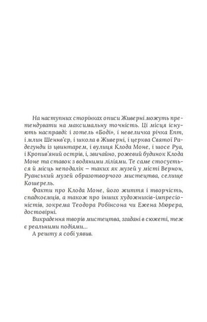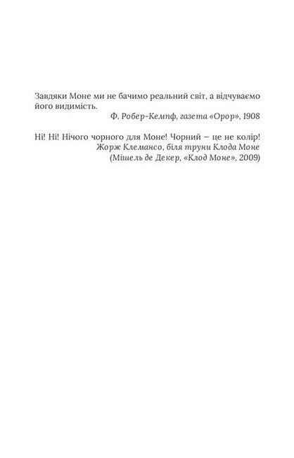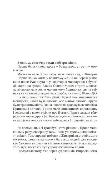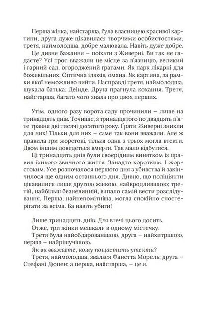 У Живерні, улюбленому містечку Клода Моне, зазвичай тихому і спокійному, сталося вбивство… В основі сюжету — життя трьох жінок: дівчинки-художниці, молодої чарівної вчительки й старенької пані, яка бачить і знає все. Усі троє геть різні, проте їх об’єднує одна таємниця: вони мріють назавжди поїхати звідси. Та чи так легко покинути свою золоту клітку? До того ж містечком ширяться чутки про викрадені картини Моне, серед яких нібито має бути відоме полотно — «Водяні лілії» в чорних тонах. І на тлі всього цього вирує руйнівна пристрасть…