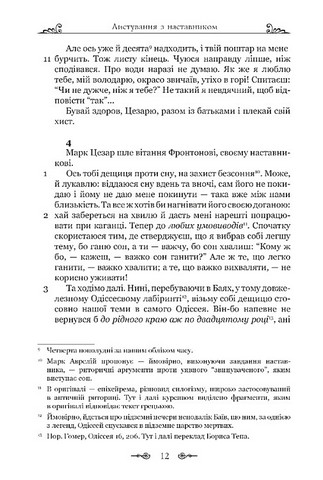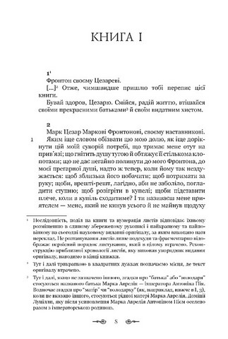 Листування Марка Аврелія з його наставником у риториці й близьким приятелем Марком Корнелієм Фронтоном розкриває малознану сторону особистості імператора-філософа, доповнюючи образ мудреця-стоїка, відомий зі славнозвісних роздумів «Наодинці з собою», жвавими, зворушливими деталями. Темою листів стають і літературні уподобання, і вправи в риториці, і яскраво описані враження від буденних подій, і вічно актуальні розмови про погоду та здоров’я — про все це приятелі висловлюються з непідробною відвертістю почуттів.