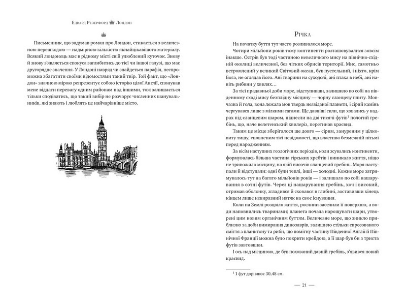«Лондон» — захопливий історичний роман Едварда Резерфорда про місто, що є серцем Великої Британії. Про те, як воно виникло і розвивалося, про його світлі й темні часи. Про довгу дорогу до демократії, появу імпічменту — у XIV столітті! — і про те, як у боротьбі з парламентом монархи завжди програвали. Читач дізнається, як було створено Англійський банк і винайдено державний борг, чому Шекспір не друкував своїх творів і як з’явився весільний торт.