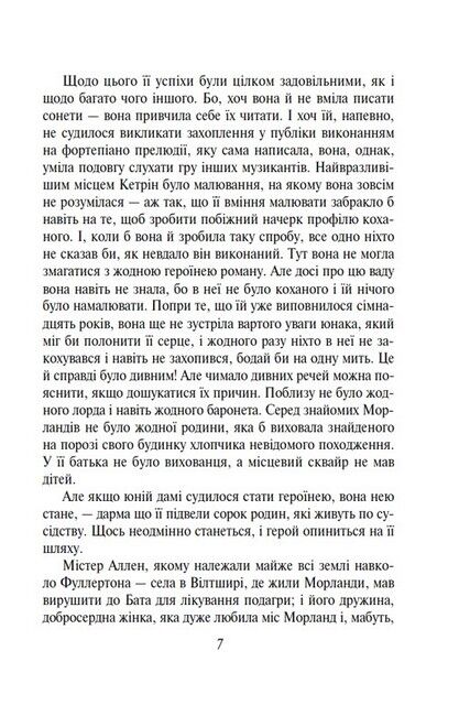 «Нортенгерське абатство» — легка, захоплююча та смішна історія про сімнадцятирічну дівчину, яка занадто серйозно сприймає все, про що читає на сторінках улюблених книжок, уявляючи себе героїнею готичного роману. Шляхом помилок вона вчиться пізнавати, хто її істинний друг, і знаходить своє кохання.