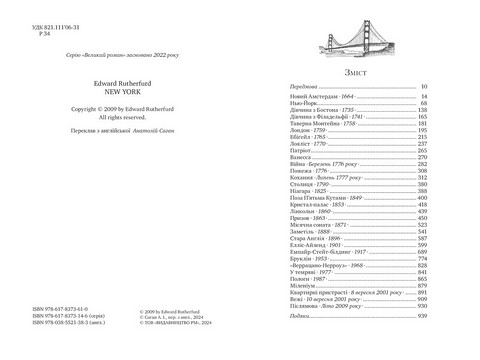 «Нью-Йорк» — книжка, на яку чекали мільйони шанувальників Едварда Резерфорда. Блискуче поєднання романтичних епізодів з картинами баталій, сімейних драм та особистих тріумфів чудово відображає пошуки свободи та процвітання в центрі історії США.