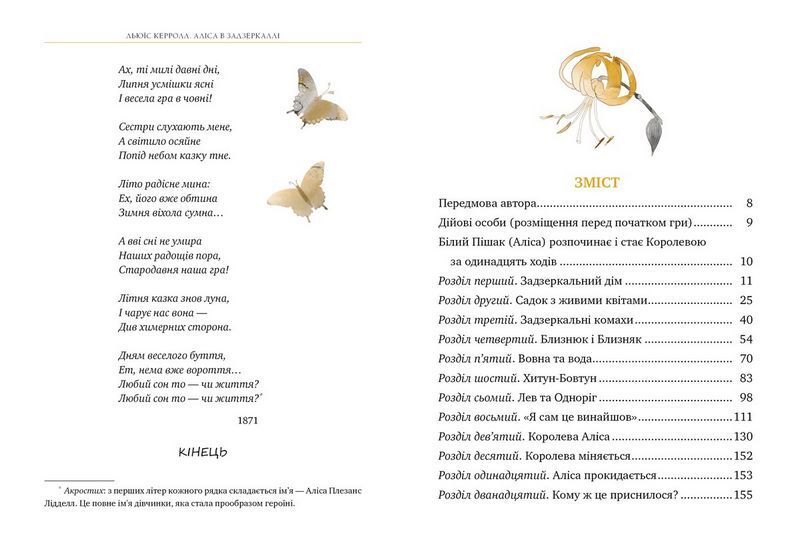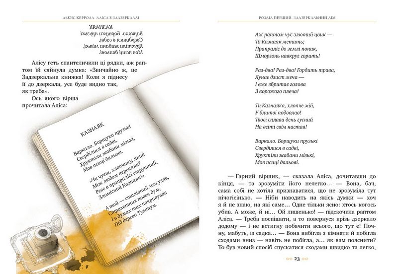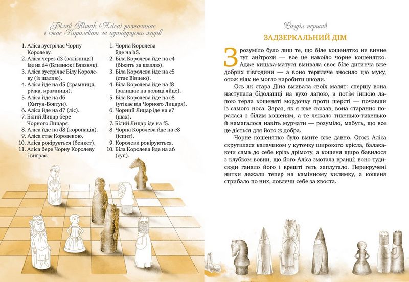 Нові пригоди улюбленої героїні — не менш захопливі, ніж у Країні Див. Задзеркалля — незвичайна країна. «Ніби велетенська шахівниця», — каже про неї Аліса. Кожен хід у цій грі і справді стане цікавою несподіванкою, яка вразить усіх, хто порине у дивовижний світ цієї казкової повісті...