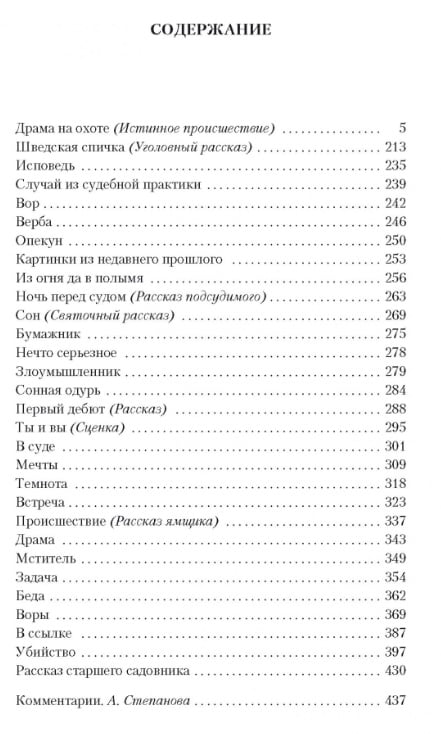 В сборник произведений А. П. Чехова, объединенных темой преступлений, вошли его рассказы и повести разных лет, а также роман «Драма на охоте» (по мотивам которого снят фильм «Мой ласковый и нежный зверь»). Кого-то из чеховских героев толкает на путь преступления бедность, кого-то — любовь. Растрата казенных денег, убийства, грабежи, мошенничество — обвиняемые предстают перед судом за различные преступления. Кто-то из них опустошен и безразличен к собственной участи, кто-то испытывает страх перед будущим, а кто-то не чувствует за собой вины. Чеховская художественная палитра настолько богата, что для каждой истории выбраны свои краски.