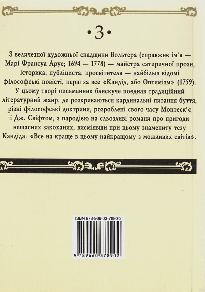 З величезної художньої спадщини Вольтера (справжнє ім’я - Марі Франсуа Аруе; 1694-1778) - майстра сатиричної прози, історика, публіциста, просвітителя - найбільш відомі філософські повісті, перш за все «Кандід, або Оптимізм» (1759). У цьому творі письменник блискуче поєднав традиційний літературний жанр, де розкриваються кардинальні питання буття, різні філософські доктрини, розроблені свого часу Монтеск’є і Дж. Свіфтом, з пародією на сльозливі романи про пригоди нещасних закоханих, висміявши при цьому знамениту тезу Кандіда: «Все на краще в цьому найкращому з можливих світів».