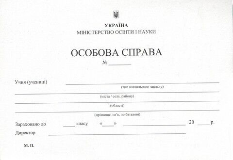 - Особова справа є обов’язковим документом, що заводиться на кожного учня з моменту вступу до навчального закладу і до його закінчення, відповідно до «Інструкції з ведення ділової документації у загальноосвітніх навчальних закладах I—III ступенів» (наказ МОН України №240 від 23.06.2000) та наказу «Про затвердження інструкції про переведення та випуск учнів навчальних закладів системи загальної середньої освіти усіх типів та форм власності» (наказ МОН України №319 від 14.04.2008).