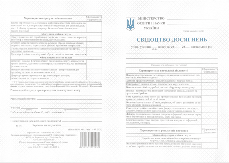 Свідоцтво досягнень учня/учениці 3–4 класу НУШ Підручники і Посібники