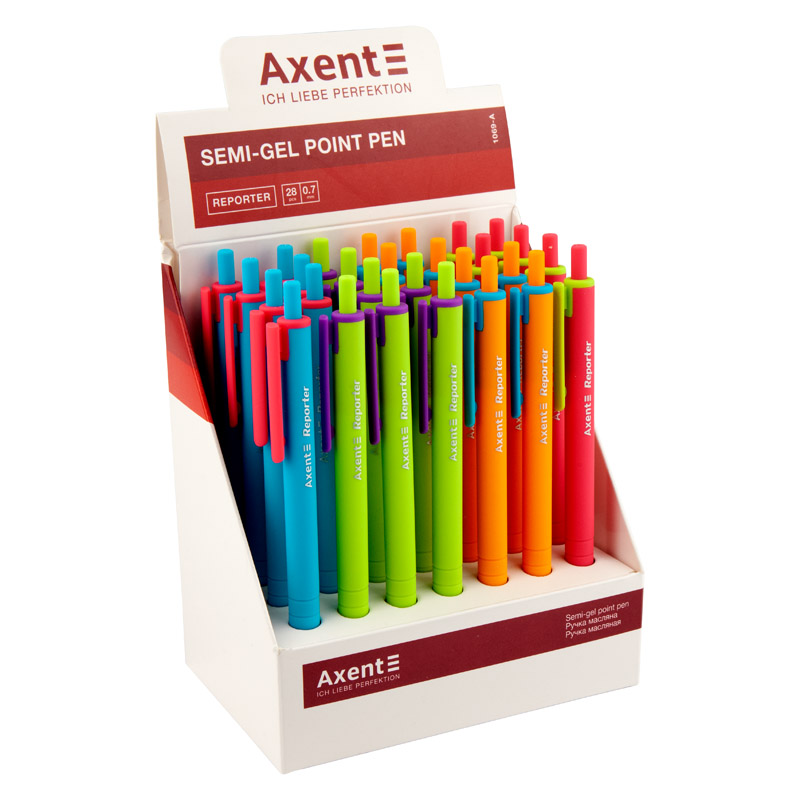 Ручки масляні поєднують переваги кулькових і гелевих ручок: 1) чорнило миттєво висихає, не розмазується, 2) помірна витрата чорнила, 3) м'яке письмо, не вимагає тиску на папір. Крім того, Ручки масляні здатні писати при низьких температурах, до-20С. Автоматична Ручка масляна Axent Reporter Color має яскраві кольори корпусу, які заряджають енергією. Корпус ручки виконаний з міцного пластику. Зручна область захоплення з рельєфними ділянками зменшує втомлюваність руки при письмі. Легке, гладке і акуратне письмо забезпечують високоточний швейцарський пишучий вузол і високоякісне чорнило. Пишучий вузол здійснює максимальне зчеплення з поверхнею паперу і однорідну та безперебійну подачу чорнила, а масляне чорнило плавно лягає, залишаючи рівну чітку лінію. Стержень має стандартну довжину 107 мм і тонкий пишучий вузол - 0.7 мм. Для заміни підходить стержень типу ASR1028-A. Довжина написання 800 м.