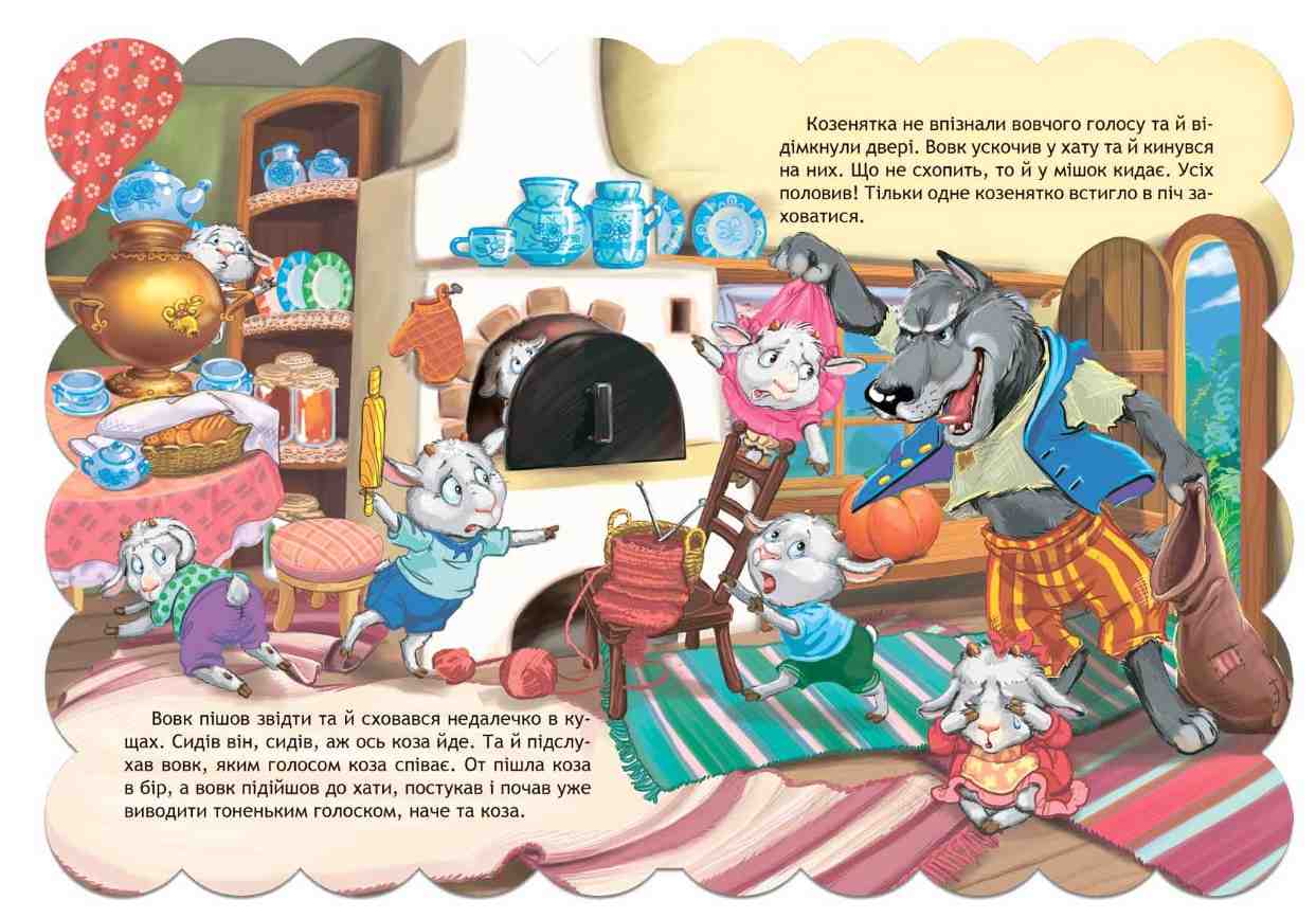 Кращі українські казки Вовк і коза. Казка про хоробру й винахідливу козу, яка зуміла врятувати своїх козенят від підступного вовка. Пропонуємо серію українських народних казок для дітей з дотепними та яскравими малюнками. Тексти казок адаптовано для малюків. Хвиляста форма книжок активізує тактильну діяльність дитини, стимулюючи її загальний розвиток.