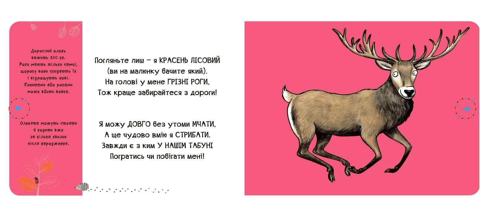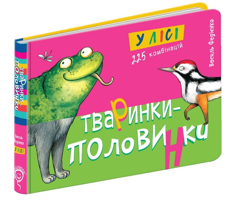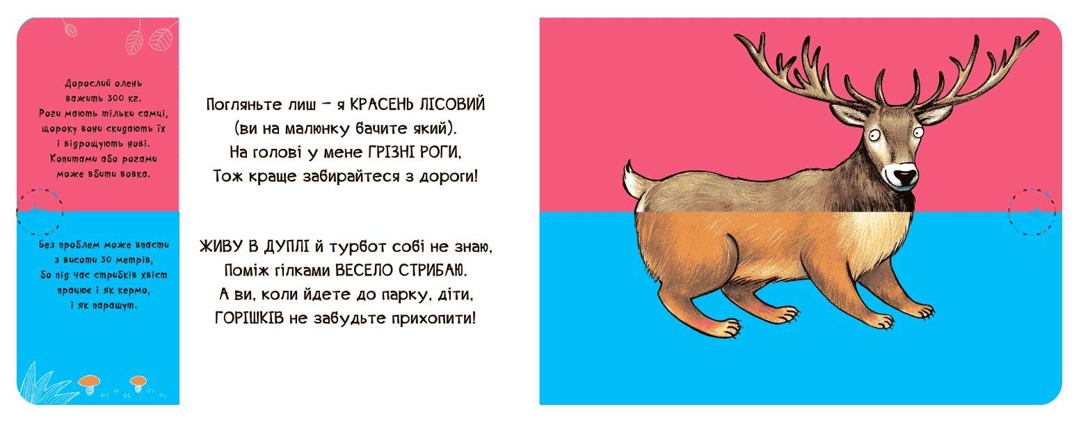 Тваринки половинки У лісі 2+. Розвивальна книга-гра з рухомими елементами для читання дорослими дітьми. Сприятиме розвитку ерудиції та пам’яті, уяви та мовлення. У книзі зібрано найпоширеніших лісових тварин, з половинок яких можна утворити понад 200 комбінацій! Як працювати з книгою: ознайомте дитину з реальними тваринами, прочитайте їй віршики-описи та цікаву додаткову інформацію. Розкажіть, що ще ви знаєте про цих тварин. Створіть казкових тварин-міксів, комбінуючи варіанти. Придумайте для них назви наприклад: щулень, жабан, вовтел та ін. та прочитайте нові віршики-описи.