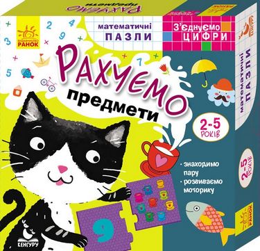 З'єднуємо цифри Рахуємо предмети 2-5 років Кенгуру Ранок. Набори розвивальних математичних карток! Що необхідно зробити? Подивитись на цифру! Назвати її. Знайти другу половинку цього пазла із зображенням відповідної кількості предметів (точок, інших деталей).