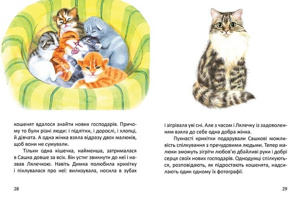 У нашу збірку ввійшли зворушливі оповідання про тварин. Такі книги формують ставлення до оточуючих, виховують дитину, роблять її уважною, чуйною людиною. Дуже важливо, щоб саме в ранньому віці малюк познайомився із захоплю-ючими історіями про тварин, щоб його душа збагатилася переживаннями про братів наших менших. Це ще більш важливо для сучасних дітей, у яких комп'ютерні ігри часто замінюють спілкування з живою природою. Наша книга адресована юним читачам, які роблять перші кроки самостійного читання. Саме тому тут використовується великий шрифт, а барвисті ілюстрації спонукають розглядати деталі, розвивають увагу, уяву. Така книга обов'язково сподобається малюкам.
