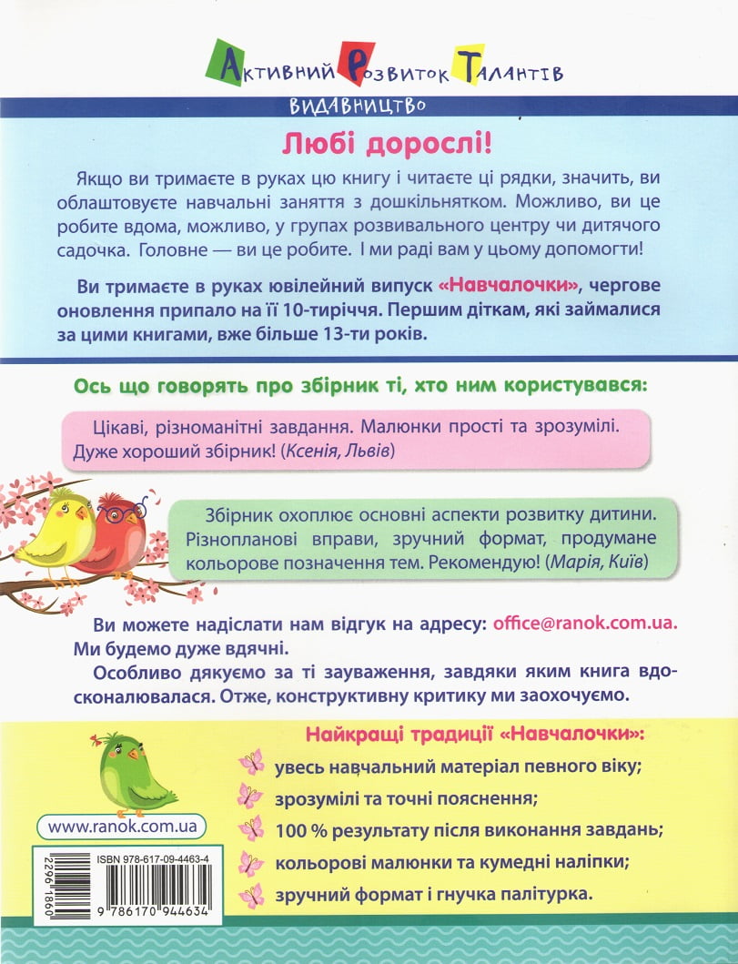 «Навчалочка» — оновлене ювілейне видання! Якщо ви збираєтесь облаштовувати заняття з дошкільнятком, тоді вам сподобається ця серія. Протягом 10 років дітки зростали і розвивалися разом із «Навчалочкою». Найкращі традиції «Навчалочки»: